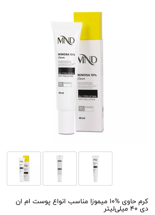 کرم حاوی %10 میموزا ترمیم کننده آسیب های پوستی مناسب انواع پوست ام ان دی 40 میلیلیتر